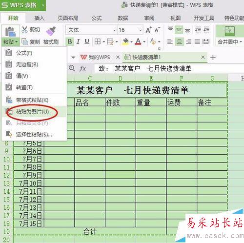 3、找一個空白單元格,選擇excel右上交的粘貼功能小圖標,點開可以看見許多小的分向,選擇粘貼為圖片。