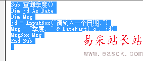 4、給jd變量賦值,我們使用inputbox函數,并設置一個提示“請輸入一個日期:”,然后使用datepart函數來對inputbox返回的日期值,進行季度判斷。其參數為q。記住q的輸入必須以雙引號包括。