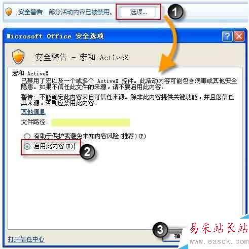在宏的安全性等級設置成功后,再次翻開Excel程序文件時,在信息欄(修改欄上方)會呈現下圖所示的正告信息,此刻點擊其間的“選項”按鈕翻開Office安全選項對話框,在其間挑選“啟用此內容”選項并斷定即可使本程序正常運轉。