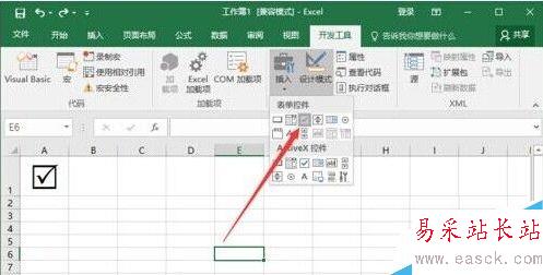 9、在開發(fā)工具選項卡中,依次點擊“插入”--表單控件下的“打勾方框”選項。如圖所示;