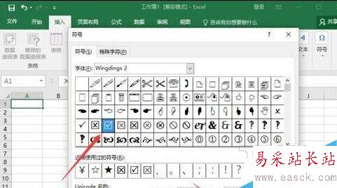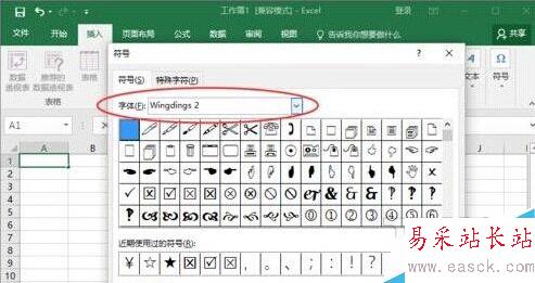 4、點擊“符號”選項后,這個時候會打開“符號”對話框,在“符號”對話框中,將字體樣式選擇為“Wingdings 2”。如圖所示;