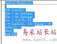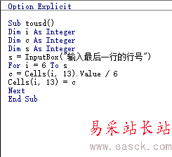 3、我們來閱讀一下這段代碼,首先是變量聲明,建立過程,然后聲明了2個變量i和c,其中i變量用來循環,c變量用來儲存單元格原值并計算。
