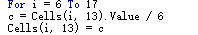 4、使用for循環,將i值循環賦予6to17,每次都將13列單元格值計算后寫入原對應單元格中,使用的公式為人民幣與美元的匯率6:1。