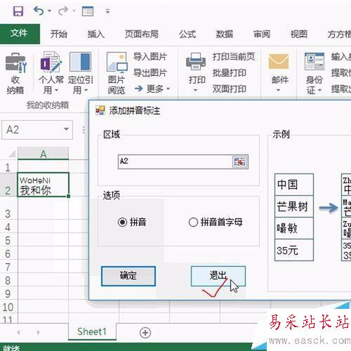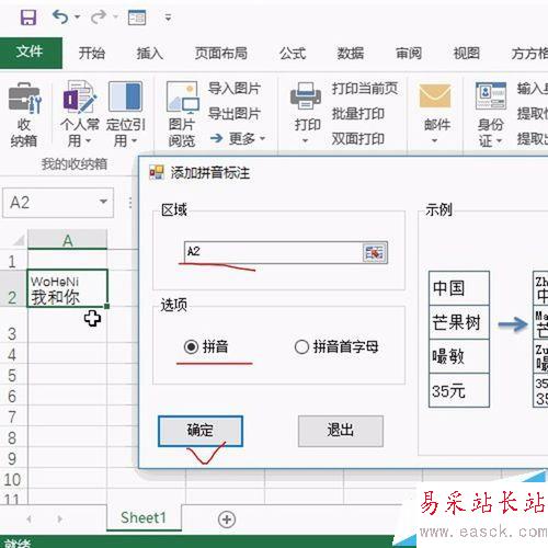 4、在彈出的對話框中,我們選擇標注的單元格,以及拼音標注選項,單擊確定,即可看到在漢字的上方出現了拼音,如下圖所示:
