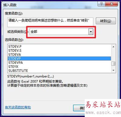 3、出現【插入函數】的窗口,點擊【選擇類別】,選擇【全部】,找到標準差的函數【STDEVP】;