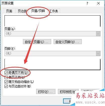 3、打開頁面設置窗口后,點擊頁眉頁腳選項卡,勾選奇偶頁不同復選框。