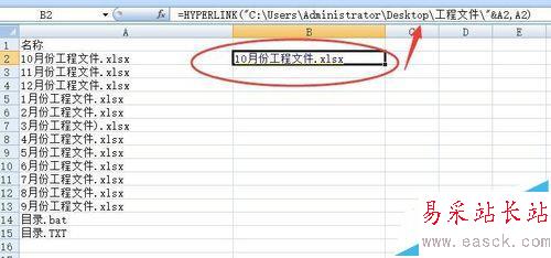 3、在B2單元格輸入公式:=HYPERLINK("C:/Users/Administrator/Desktop/工程文件/"&A2,A2),并將公式向下填充。