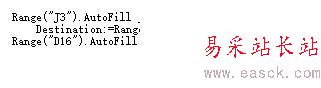 5、接著我們使用autofill函數來填充給定的單元格區域。其中,自動填充的公式單元格豎列指定的是J3,橫行指定的是D13,代碼如圖。