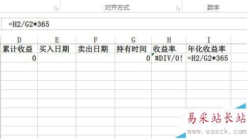 4)年化收益率=(累計收益/購入成本)/持有時間*365天。所以在最后一欄輸入【=H2/G2*365】,輸入完畢后點擊回車。