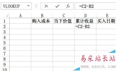 1)累計收益=當下價值-購入成本。所以在D2欄輸入【=C2-B2】,輸入完畢后點擊回車。