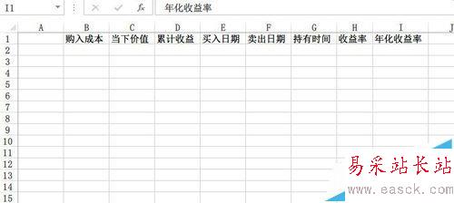 2、輸入項目。如圖,分別輸入項目:購入成本,當下價值,累計收益,買入日期,賣出日期,持有時間,收益率年,化收益率。