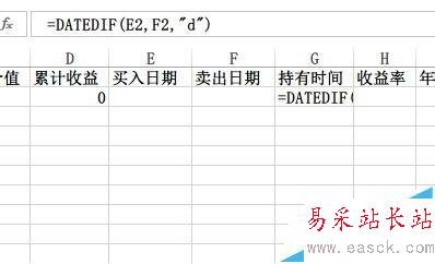 2)持有時間=賣出日期-買入日期。所以在G2欄輸入【=DATEDIF(E2,F2,"d")】,輸入完畢后點擊回車。
