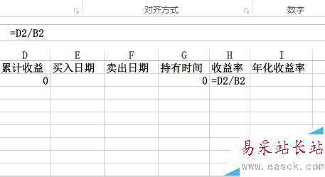 3)收益率=累計收益/購入成本。所以在H2欄輸入【=D2/B2】,輸入完畢后點擊回車。
