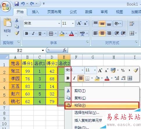 3、現在重點來了。我們“得分2”排名,僅需要進行如下操作:復制“名次1”列的名次,然后選中“得分2”得分區域,點右鍵,選‘粘貼’(注意,不要選成‘選擇性粘貼’)