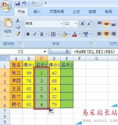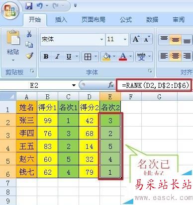 4、名次已排好。如果在步驟1中你選用的是第一種公式,那這一步將出錯。因為第一種方法鎖定了“B”列,復制過來之后依然將b2到b6作為排名區域。而第二種方式沒有鎖定“B”列,因此復制過來公式自動把“B”改成了“D”,正好是“得分2”的范圍