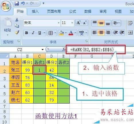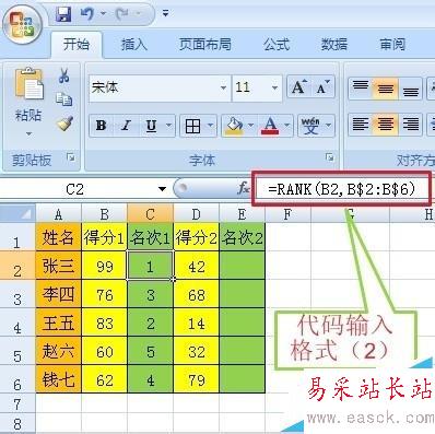 1、如果數據是縱向的,我們可以選中名次所在列第一格(如圖中為c2),鍵入公式"=rank(b2,$b$2:$b$6)" ,然后回車。公式中的"b"指的是排名次數據(得分1)所在列,“b2”指c2格對應的b2格數據的名次,“$b$2:$b$6”是指數據范圍從b2到b6."$"的做用是指鎖定后面的字符。