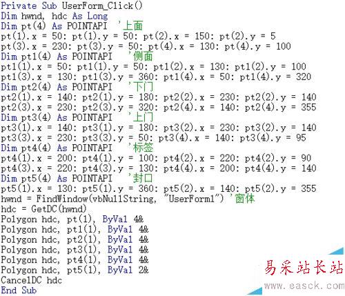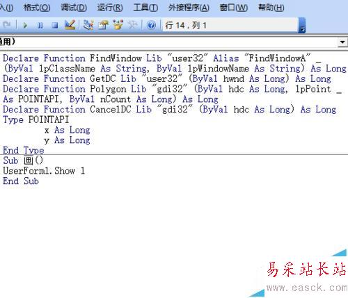 6、窗體編程。雙擊窗體進入編程界面,編寫窗體單擊事件觸發的程序,調用模塊1里聲明的1個結構、4個函數編寫程序。為圖中每個點寫好坐標。
