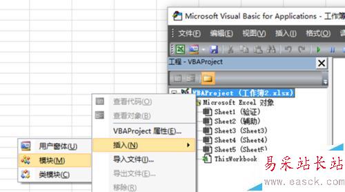 3、在 VBA編輯窗口,“工程窗口下”點擊“VBAproject(工作簿的名稱)”,右鍵:“插入”->"模塊"