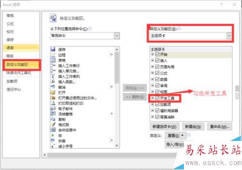 1、在功能區設置出excel 開發工具選項。默認的excel的開發工具選項不在功能區里顯示,所以需要我們手動設置。打開excel文件,依次點擊“文件”->"選項"。在彈出的對話框里,點擊“自定義功能區”,在右側的“自定義功能區”下拉列表里選擇“主選項卡”,然后勾選“開發工具”,點擊“確定”