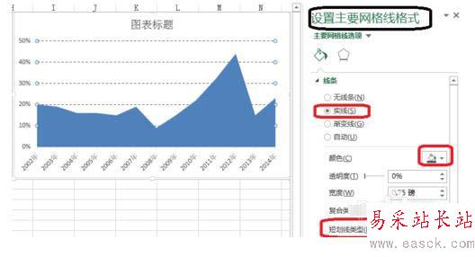 3、設置主要網格線格式——實線——顏色——短劃線類型(短劃線)。