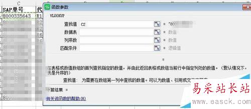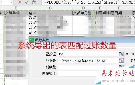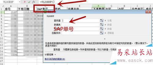 3、將下單數量變成實際的出庫數。輸入“=”使用利用vlookup函數,兩表相同信息從左到右第一個為單號,利用單號匹配,查找值=“SAP單號”,數據源表為實際出庫數所在的表。