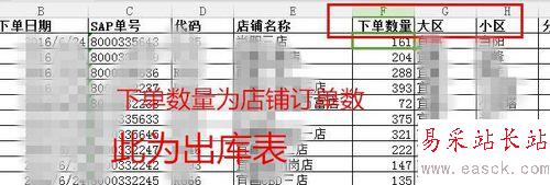 1、首先,表一為出庫表,有下單的單號,店鋪信息,下單數(預計訂單數),以及區域等信息。