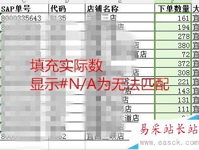 4、實際出庫數位于該表第3列。精確匹配出數量,邏輯值=0,此時按下enter會顯示正確的出庫數,十字填充該列,無法匹配#N/A表示該訂單還沒過賬(出庫)。