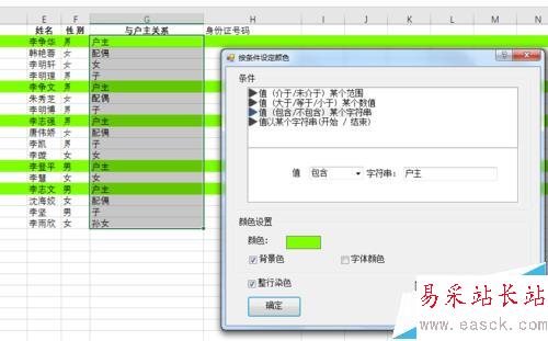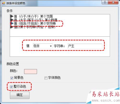 3、選擇 值包含 某個字串,字串填寫“ 戶主”。填充選整行。