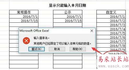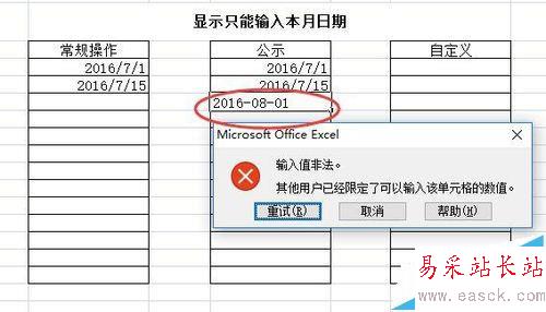 3、確定之后,我們看一下效果,可以看到輸入7月日期可以,但是輸入8月份的日期就會(huì)報(bào)錯(cuò)了。