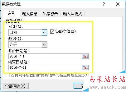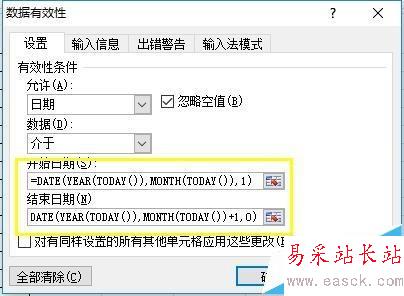 2、有效性條件設(shè)置:日期格式,數(shù)據(jù)介于,開始日期和結(jié)束日期輸入當(dāng)月1日和當(dāng)月最后一日的日期。