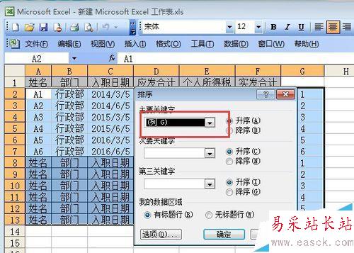 3、選擇區域A2-G13,再點擊數據--排序,主要關鍵詞選擇列,如圖