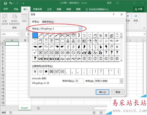 5、在“符號”對話框中,將字體樣式選擇為“Wingdings 2”。如圖所示;