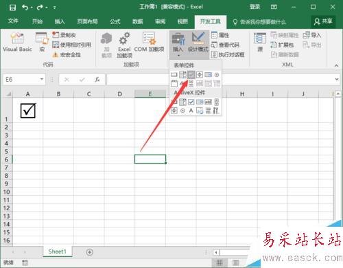 9、在開發(fā)工具選項卡中,依次點擊“插入”--表單控件下的“打勾方框”選項。如圖所示;