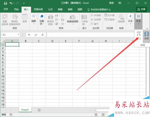 3、在插入菜單選項卡中,點擊“符號”功能區(qū)的“符號”選項。如圖所示;
