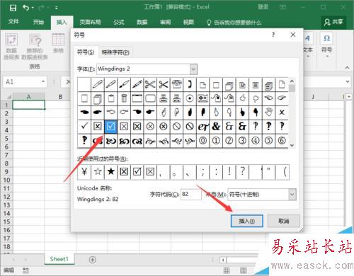 6、在“Wingdings 2”字體樣式下,找到打勾方框選項并選擇它,然后點擊“插入”按鈕。如圖所示;