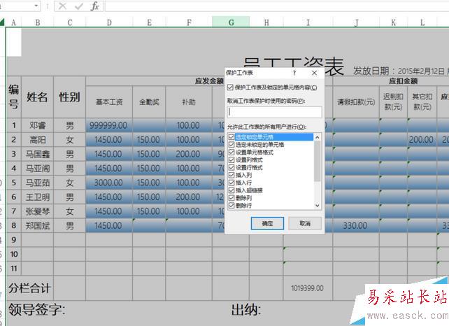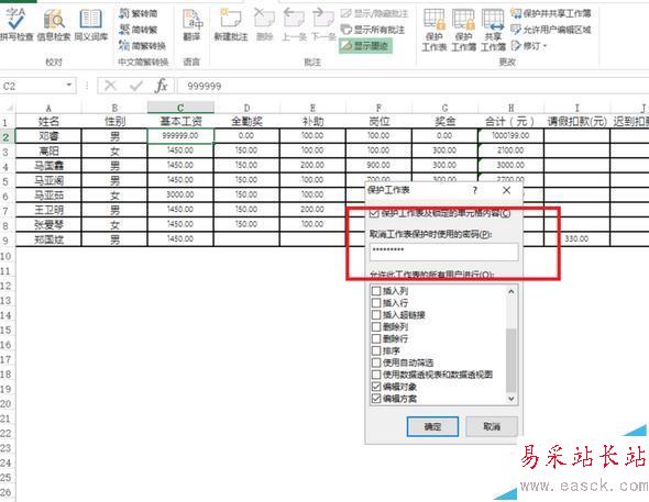 5、接下來在審閱標簽面板下點擊保護工作表選項,并且勾選所有保護選項,禁止使用者對輸出頁面進行修改。可以通過設置密碼來提高安全性。