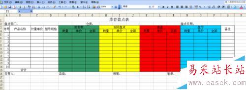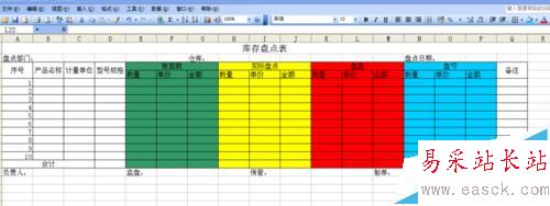 6、給賬面數、實際盤點、盤盈、盤虧的背景色分別改為綠色、黃色、紅色、藍色。