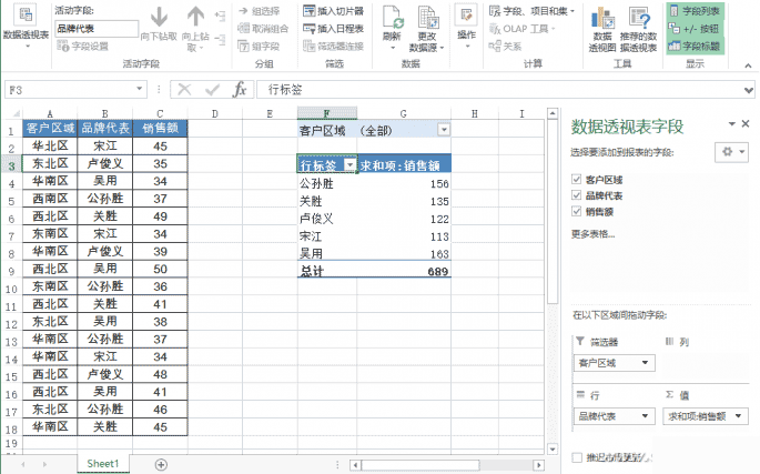 選擇數(shù)據(jù)區(qū)域中的任何一個(gè)單元格,點(diǎn)擊“插入”選項(xiàng)卡中的“數(shù)據(jù)透視表”,在彈出的“創(chuàng)建數(shù)據(jù)透視表”窗口,“選擇放置數(shù)據(jù)透視表的位置”處選擇“現(xiàn)有工作表”,位置處選擇F1單元格。在右側(cè)的“數(shù)據(jù)透視表字段”中,將“客戶區(qū)域”拖放到“篩選器”處,將“品牌代表”拖放到“行”處,將“銷售額”拖放到“值”處(圖2)。