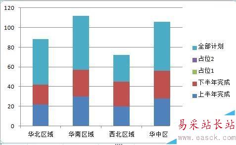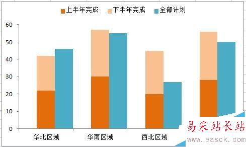 1、制作數據源,以華南、華北、華中、西北區域的銷量和總計劃制作總量顯示的柱狀圖。