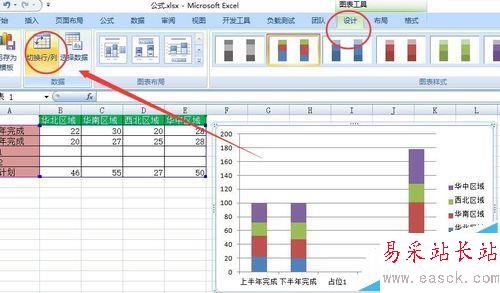 4、選擇圖表,在設計選項卡中單擊切換行列。