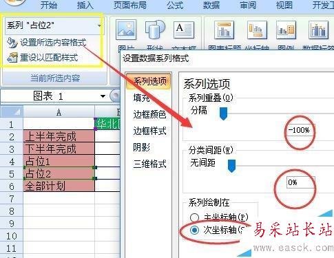 6、在【布局】選項卡下,在【當前所選內容】下拉列表中選擇系列”占位2”,單擊【設置所選內容格式】,系列重疊設置為-100%,分類間距設置為0%,數據系列設置為次坐標軸