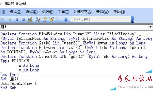 3、在模塊1內編程,聲明4個函數,并編寫一句顯示窗體的程序——“畫”。