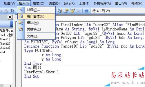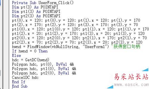 6、雙擊窗體進入編程界面,編寫窗體單擊事件觸發的程序,調用模塊1里聲明的1個結構、4個函數編寫程序。