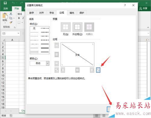 5、在“邊框”選項卡中,選擇右下角的“斜線”點擊它,而后再點擊“確定”按鈕。如圖所示;