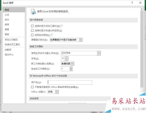 4、點擊“選項”命令選項后,這個時候會打開Excel選項對話窗口。如圖所示;