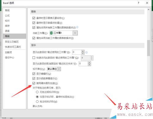 6、在“高級”選項卡的右側窗口中,找到“顯示”分組中的“禁用硬件圖形加速”選項,并將其打勾即可。如圖所示;