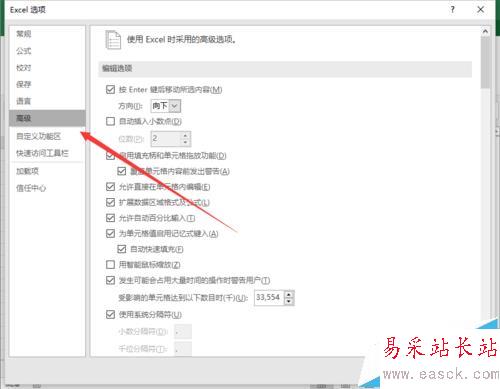 5、在打開的Excel選項對話窗口中,將選項卡切換到“高級”選項卡欄。如圖所示;