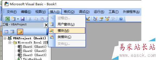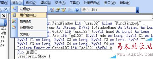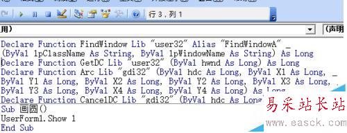 3、在模塊1內編程,聲明4個函數,并編寫一句顯示窗體的程序——“畫圓”。