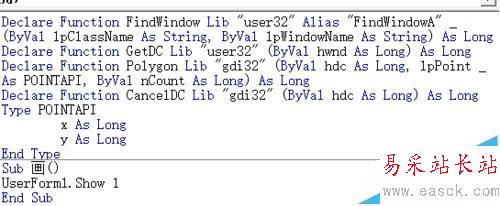 3、在模塊1內編程,聲明4個函數、1個結構,并編寫一句顯示窗體的程序——“畫”。