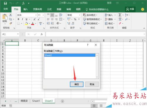 5、這個時候會彈出一個“取消隱藏”對話框,在里面選中需要顯示的工作表,然后再點擊“確定”按鈕。如圖所示;